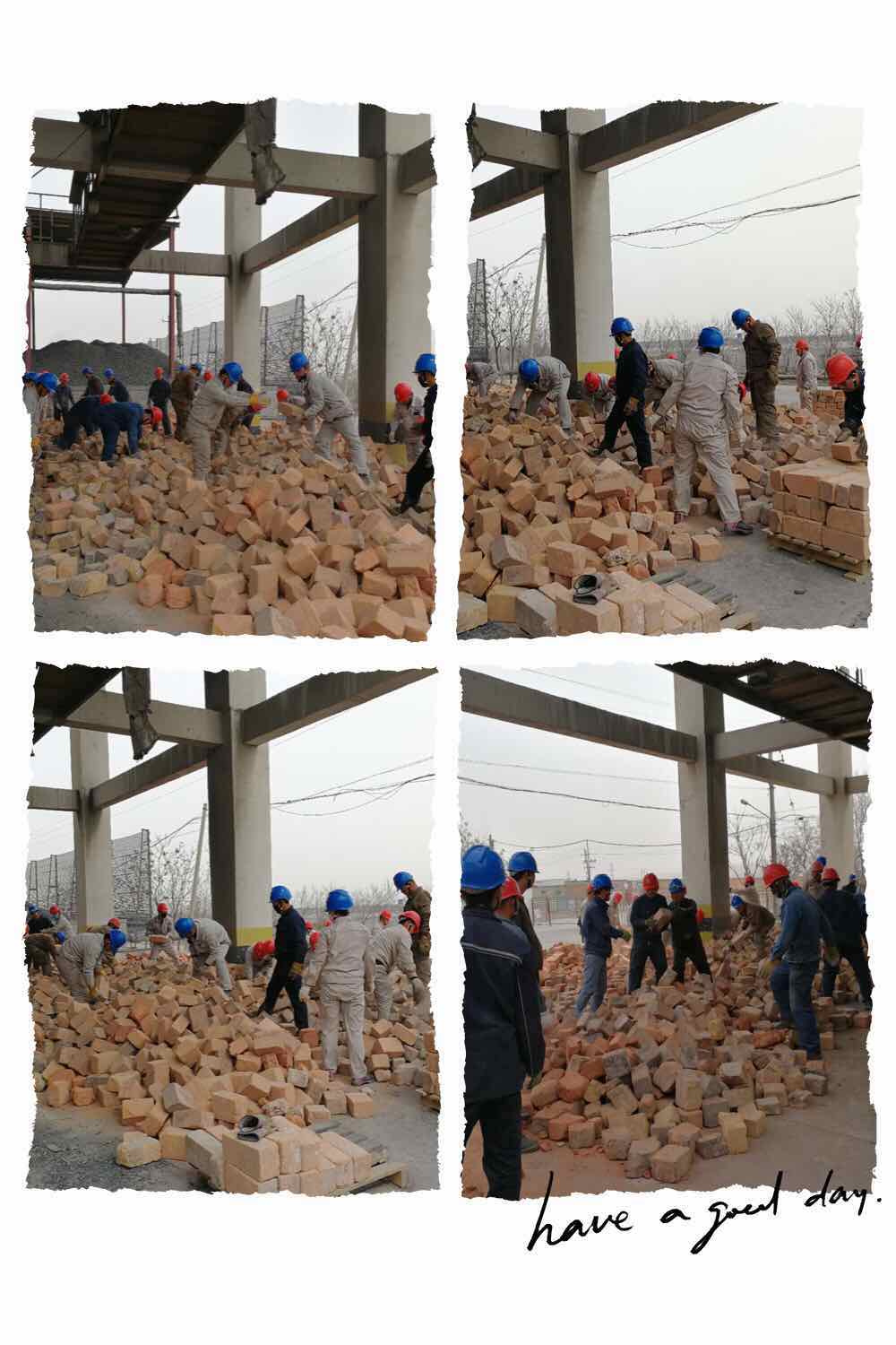 近幾天,公司領(lǐng)導(dǎo)帶領(lǐng)各裝置日勤人員,篩檢白灰窯拆除下來(lái)的能重復(fù)利用的舊耐火磚,大家齊心協(xié)力,沒(méi)有一句怨言,有的只是埋頭苦干,正是這樣一群可愛(ài)的人將美好的希望播種在白灰窯的各個(gè)角落,默默堅(jiān)守辛勤耕耘等待著收獲,絕緣抗壓的勞保鞋,厚實(shí)的手套是他們作戰(zhàn)的防護(hù)裝備,任憑天氣如此炎熱都不會(huì)拋棄,他們時(shí)時(shí)刻刻把工作放在心中,讓“勞動(dòng)”創(chuàng)造者最美的價(jià)值。