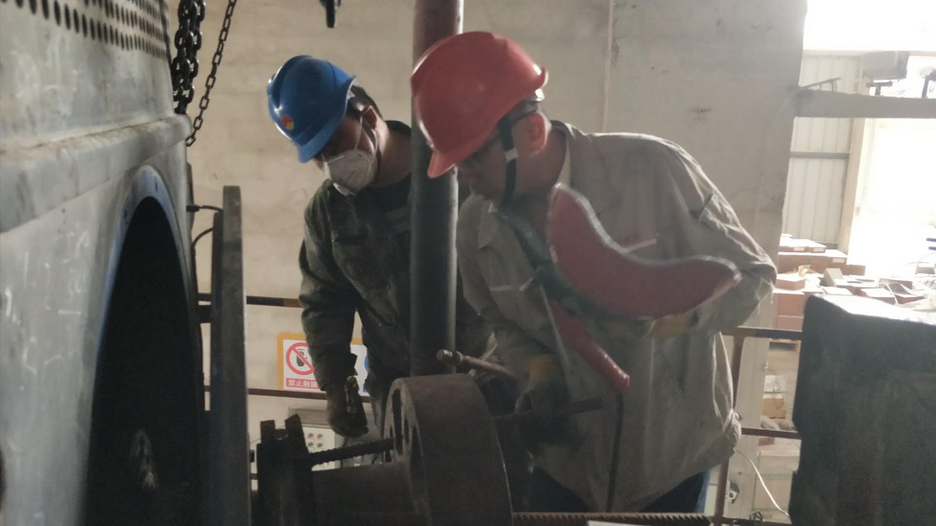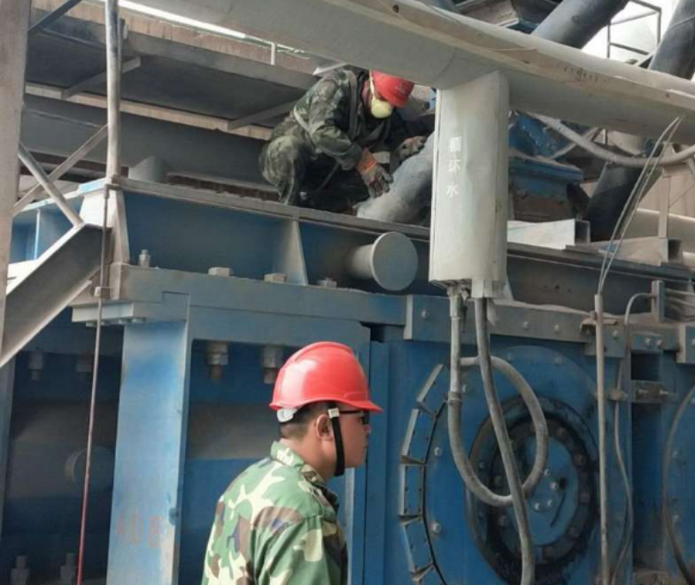 5月27日,檢修人員頂著大風(fēng)降溫,加班加點(diǎn)完成烘干破主電機(jī)和生料磨輥壓機(jī)側(cè)擋板檢修。