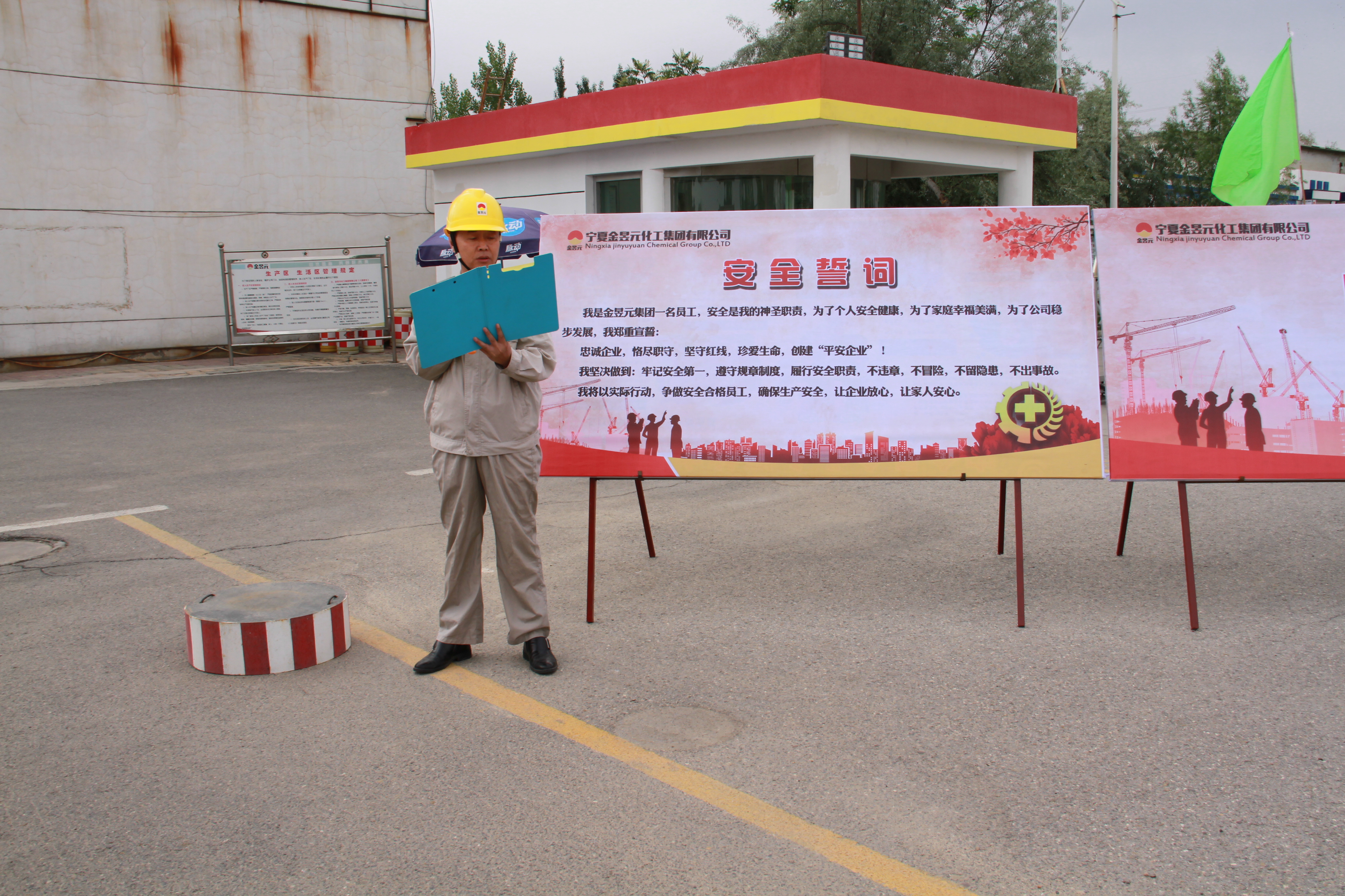 2019年6月4日8點40分許,寧夏金昱元化工集團青銅峽片區安全生產月宣傳動員及“安全生產月”活動啟動儀式即將召開。能源化學公司廠門口各色彩旗迎風招展,青銅峽片區安全生產部精心制作的一塊塊各類安全生產知識宣傳展板排列整齊一字排開,片區全體日勤人員著裝統一,列隊整齊,氣氛莊嚴肅靜。