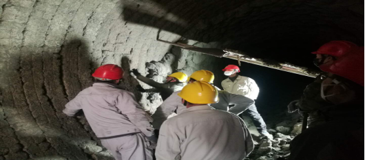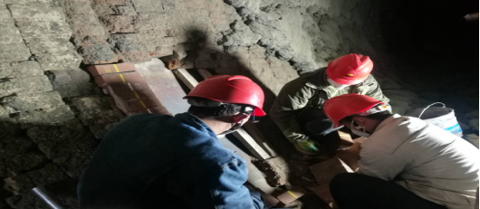 窯磚緊固。加塞,在轟鳴的風鎬聲中,夾雜著交替起落的敲擊聲,工友們,正頂著滿面的塵灰完成作業。