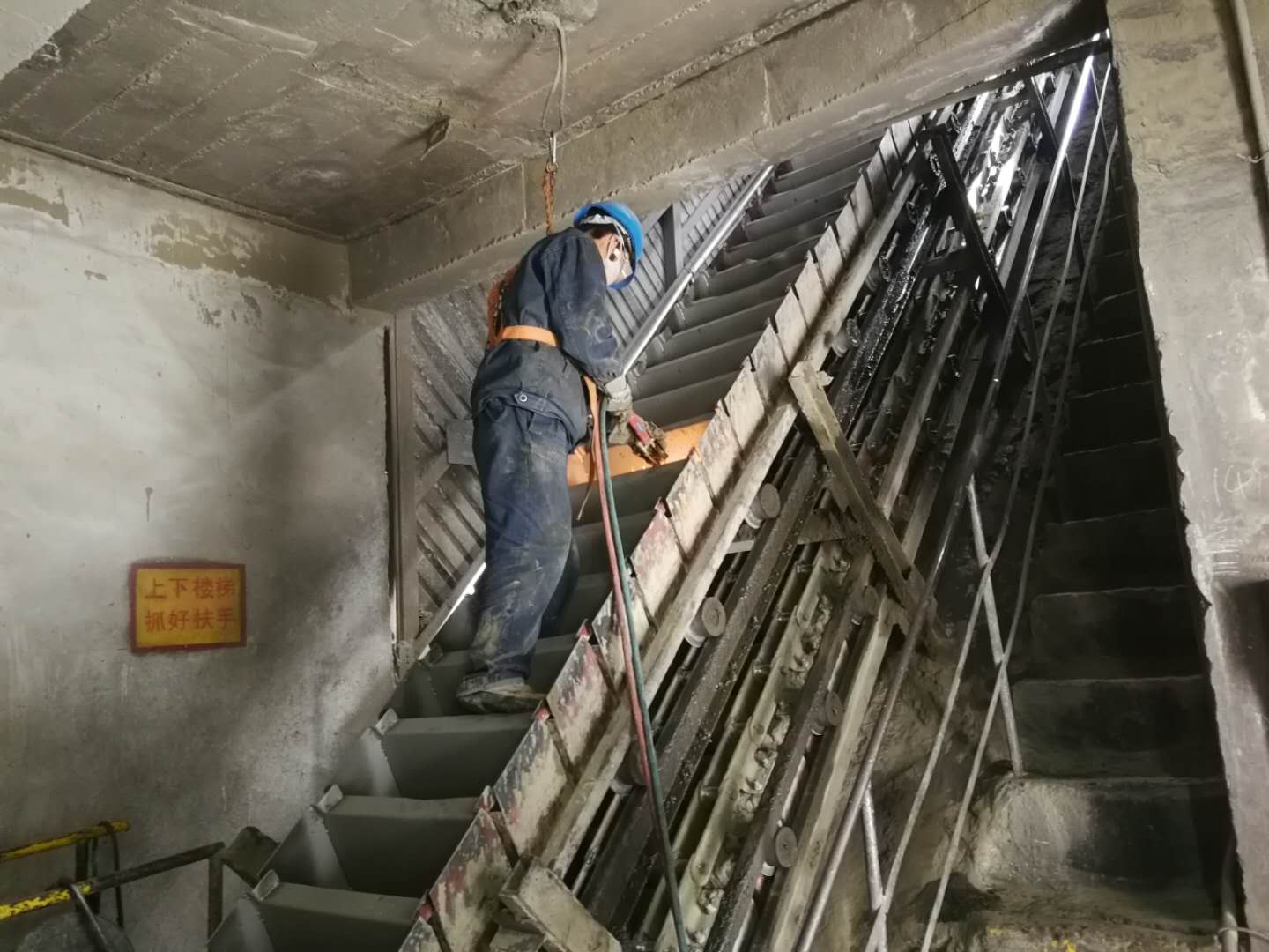 來到回轉窯檢修現場,熟料鏈斗機猶如一條巨龍矗立在45度斜廊上,維修工掛著安全帶對每個鏈斗詳細的進行檢查,發現有松動的馬上進行維護,確保檢修后鏈斗機能安全穩定的運行。