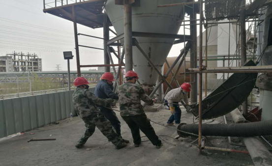在清理結皮現場,面對預熱器本身設備的炙烤外,還有夏季本身炎熱,而他們在每一處作業點,都是那樣“激戰正酣”,他們輪流揮舞著大錘敲打著鋼釬,熟練、小心的用著“水炮”,一遍又一遍,敲碎了“結皮”,疏通了管道,每一點都是力氣活,耗時耗力。有時候,往往一錘下去鋼釬卻絲毫不動,但我沒從他們臉上看到灰心的表情。近12個小時的工作量,但從井然有序的場面我仍然可以看出他們有分工也有協作,同時銘記安全第一。