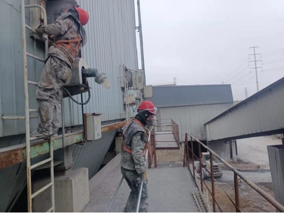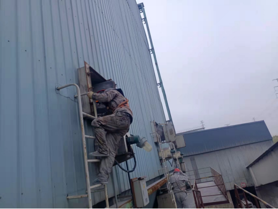 電收塵設備檢修現場,由于電收塵內部極絲斷裂和灰斗積灰嚴重,導致電收塵各電場無電壓電流顯示。11月4日19時30分,回轉窯系統止料,計劃停車24小時,檢修窯尾電收塵器。除塵器檢修都是內部操作,空間狹小,且都存在技術性,人員只能分頭進行,輪流進行更換極絲和清除積灰,用扳手、3米左右長的卸料竹竿敲打極絲,一道道工序,都存在著一定的難度,一方面靠著臂力、靠著準心,另一方面就是人工完成拆卸更換極絲,清除灰斗積灰,靠的時耐心和責任。通過檢査最終整修完成了更換11根極絲,清理了20個灰斗,圓滿完成此項電收塵器檢修任務。