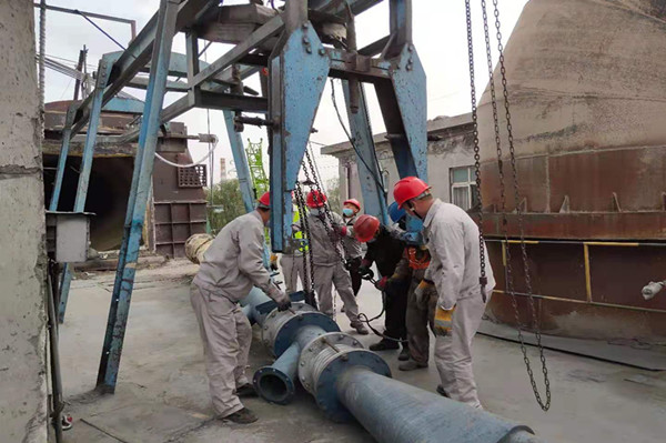 團(tuán)隊(duì)是什么,是為了實(shí)現(xiàn)一個(gè)共同的目標(biāo)而集合起來的人。 任何一個(gè)人的力量都是渺小的,只有融入團(tuán)隊(duì),只有與團(tuán)隊(duì)一起奮斗,勁往一處使,你才能實(shí)現(xiàn)個(gè)人價(jià)值的最大化,你才能成就自己的卓越!伴隨副總經(jīng)理一聲令下,所有人員喊著豪邁的口號(hào),配合吊機(jī)的力臂推動(dòng)著奇重?zé)o比的噴煤管一點(diǎn)一點(diǎn)的前行。又一會(huì)功夫?qū)⒒剞D(zhuǎn)窯門緩緩調(diào)至檢修現(xiàn)場(chǎng)安全的位置。