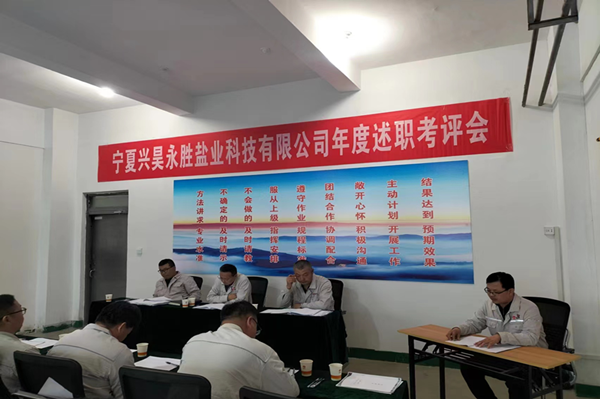 2023年11月14日,寧夏興昊永勝鹽業(yè)科技有限公司組織召開管理人員年度述職考評會議。職能科室負責(zé)人、專業(yè)技術(shù)人員、生產(chǎn)調(diào)度和各裝置正副裝置長等19名管理人員進行述職,33名職工代表列席會議。