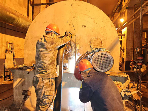 今日任務是一期八號發生器進行內部檢修,發生器加水管線酸洗,中和塔堿泵出口閥門更換等。作業負責人需率先進入發生器內部排查。辦理受限空間作業票、氣體檢測、隔離上鎖……每道程序都關乎生死。當我沿著狹窄的人孔鉆入發生器時,仿佛進入了一個與世隔絕的鋼鐵世界。手持防爆燈,仔細檢查每一條耙齒、每一個托盤。內壁上結著的堅硬電石泥結垢物,需用風鎬一點一點剔除,耙齒有損壞的,需要一個一個的更換,錘擊聲在密閉空間內回蕩,震耳欲聾。汗水很快浸透全身,專注讓不適忘記。