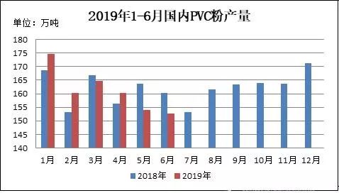 1至3月中旬,PVC行業(yè)開(kāi)工負(fù)荷維持在84.5%左右,明顯高于2018年同期的81.5%。但3月底至4月,化工行業(yè)安全事故頻發(fā),危化品行業(yè)安全生產(chǎn)監(jiān)管力度加大,PVC企業(yè)對(duì)此也高度重視,因此春檢期間,檢修企業(yè)明顯多于2018年,企業(yè)檢修時(shí)間也出現(xiàn)延長(zhǎng)。1至6月,國(guó)內(nèi)PVC企業(yè)檢修損失產(chǎn)量為79.01萬(wàn)噸,同比增加27.3%,其中4至6月的檢修損失產(chǎn)量為63.64萬(wàn)噸,同比激增59.4%。上半年行業(yè)開(kāi)工負(fù)荷前高后低,國(guó)內(nèi)產(chǎn)量同比2018年微幅下降。據(jù)卓創(chuàng)資訊統(tǒng)計(jì),1至6月,國(guó)內(nèi)PVC粉產(chǎn)量為966.6萬(wàn)噸,同比下降0.3%。