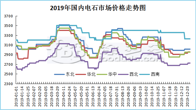 2019年中國國內(nèi)電石走勢上半年跟隨PVC走勢類似,第一季度震蕩上行整理,4月份到達(dá)年度高點,但隨后價格開始下行,下行至6月中旬又開始震蕩上漲,隨后的三四季度震蕩走低中。整體來看作為PVC上游原料,電石的走勢類似于PVC走勢,但并不完全相同,尤其下半年,我們可以推測,下面的PVC收到資金以及市場炒作以及期貨方面的影響較大,并不是從供需、原料方面受到影響。