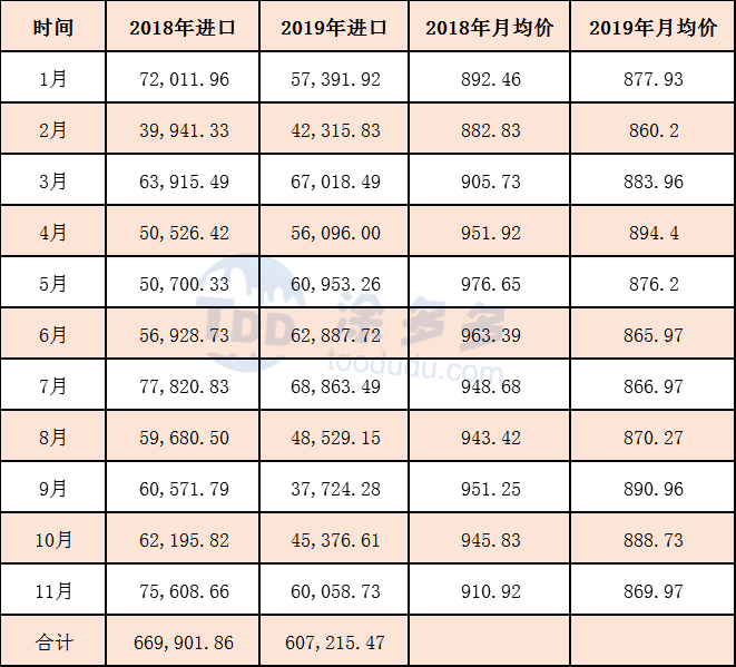2019年1-11月累計進(jìn)口數(shù)量為607215.47噸,同比去年減少62686.39噸。跌幅9.36%,國內(nèi)產(chǎn)能供給充裕,進(jìn)口量大幅下跌。