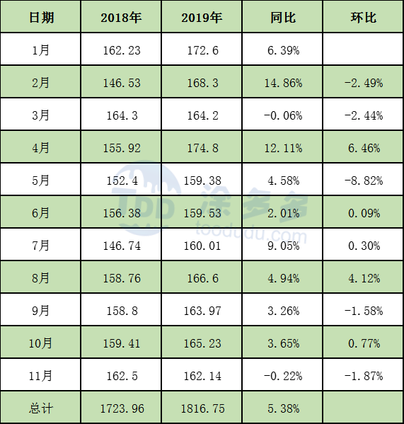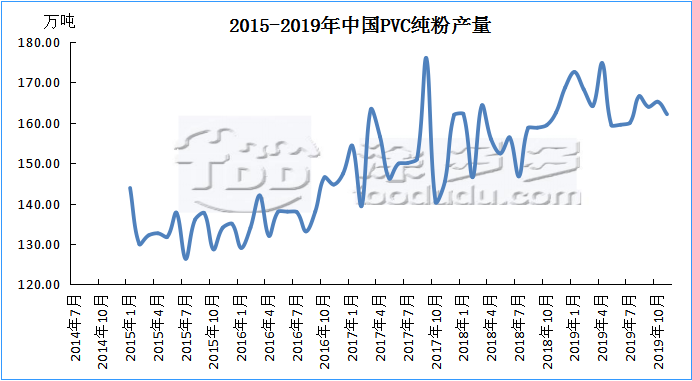 2019年1-11月PVC累計產(chǎn)量1816.75萬噸,同比去年減少92.79噸。漲幅5.38%,產(chǎn)能的凈增是產(chǎn)量增加的主要原因。