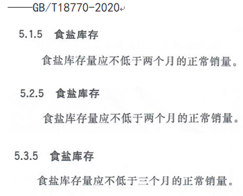GB/T18770-2020標準提出A、AA級企業“應不低于”二個月正常銷量儲備,AAA級企業“應不低于”三個月正常銷量儲備,井礦鹽區生產精制鹽按市場需要產出,不象海湖鹽區產場集中生產堆垛,在目前市場競爭條件下難以實現,能夠達到一個月正常銷量食鹽儲備都很不錯了。