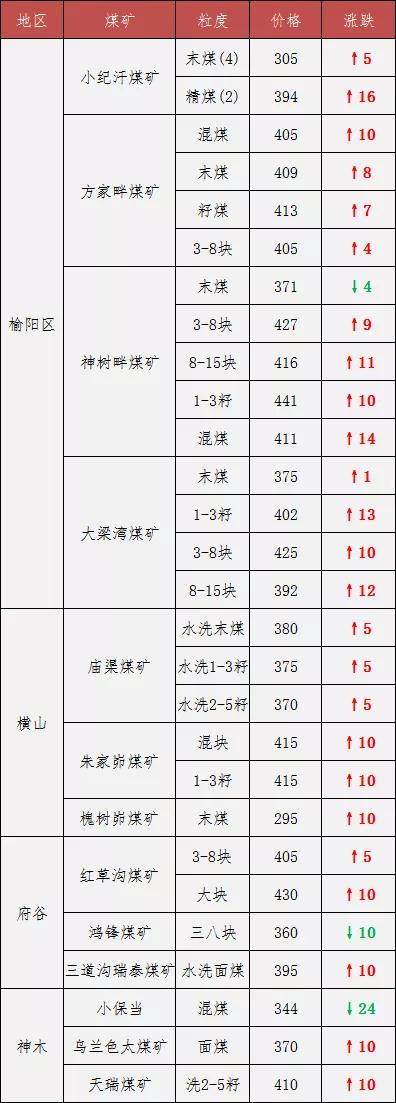 據(jù)榆林煤炭交易中心數(shù)據(jù)顯示,現(xiàn)在榆陽區(qū)(6000K 0.6S)標(biāo)準(zhǔn)煤均價(jià)已漲至399元/噸,神木(5800K 0.4S)標(biāo)準(zhǔn)煤均價(jià)漲至385元/噸,府谷(5500K 0.4S)標(biāo)準(zhǔn)煤均價(jià)漲至355元/噸。