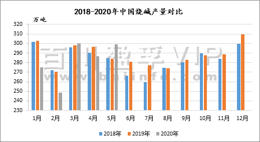 根據百川統(tǒng)計數據,2020年1-6月燒堿折百產量約1685.7萬噸,同比下滑2.9%。