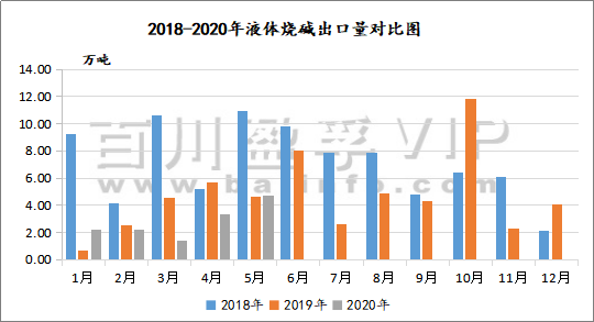 如圖所示,2018-2020年我國液堿出口量逐年下滑,2020年上半年受全球公共衛(wèi)生事件影響,我國進出口貿易受到嚴重制約,液堿出口量同比下滑明顯,絕大部分貨源需轉向國內市場消化,國內市場消化情緒亦不佳,市場持續(xù)低迷。