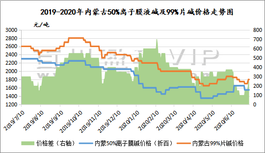 如上圖,可以明顯看出,從2019年至今,99%片堿與50%離子膜液堿折百價格差有不斷縮減趨勢,這意味著片堿行業(yè)利潤下滑,2020年上半年中國片堿市場價格大幅下滑,跌落至近十年的歷史低位。