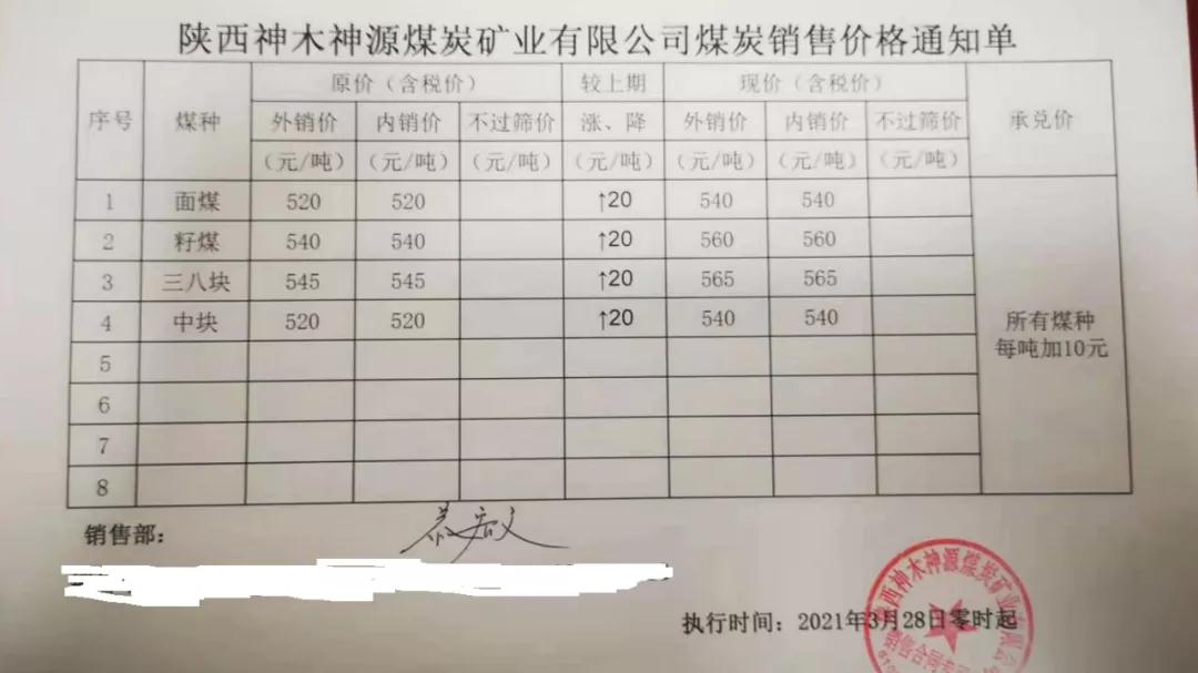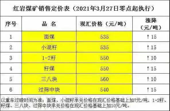 2021年3月26日18:00起,千樹塔煤礦執行面煤530元/噸,3-8塊580元/噸,8-15塊570元/噸。