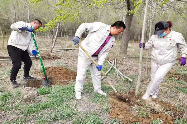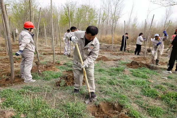 參加植樹的職工一到現場,便投入到火熱的工作中。大家或揮鍬挖坑,或扶苗培土,或提桶澆水,所有人齊心協力、相互配合,現場一片繁忙景象。